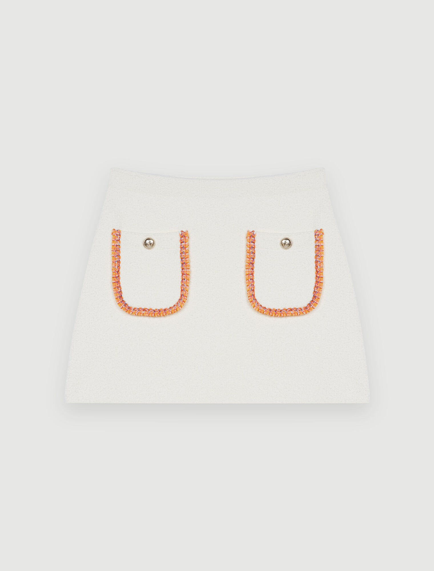 Short, straight, non-stretch knit skirt. Fringing on the front pockets. Metal buttons with the Maje logo. Elasticated waistband and concealed zip on the side. Can be worn with the MISAL cardigan. Non-stretch knit skirt Buttons with Maje logo Elasticated waistband